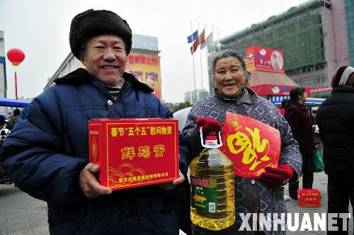 1月12日,湖北宜昌困难群众领到了由政府发放的春节慰问物资。当日,湖北省宜昌市“5个5”(50斤大米、5斤油、5斤肉、5斤鱼、5斤蛋)春节慰问物资发放工作启动,全市将有25万余名困难群众领到这份“春节大礼包”。新华社发(黄翔 摄)