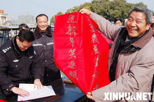 1月11日,一名返乡农民工展示芜湖交警赠送的春联。当日是全国春运启动第一天,安徽省芜湖市交警支队组织交警书画爱好者来到芜湖汽车站,为返乡乘客义务书写春联、“福”字门贴,送去平安祝福。新华社发
