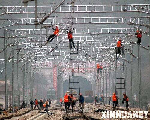 11月23日,中铁电气化局集团西安电化公司员工在安徽金寨火车站进行电气化铁路施工。全长359.36公里的合(肥)武(汉)客运专线电气化铁路预计年底投入运营。 新华社发 (倪树斌 摄)