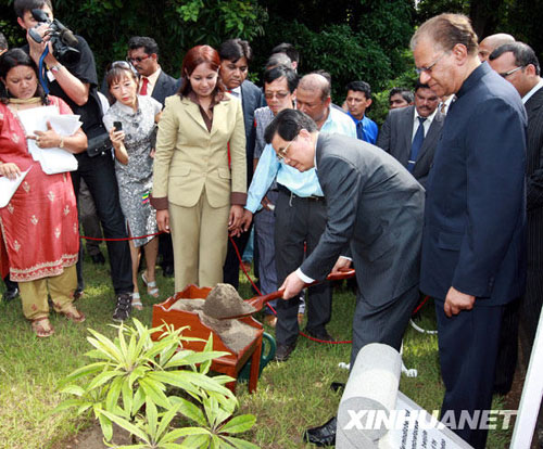 2月17日,国家主席胡锦涛在毛里求斯植物园种植象征中毛友谊万古长青的香木树。新华社记者鞠鹏摄