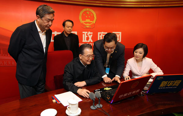 2月28日,中共中央政治局常委、国务院总理温家宝进入中国政府网访谈室,与网友在线交流并接受中国政府网、新华网联合专访。 新华社记者姚大伟 摄
