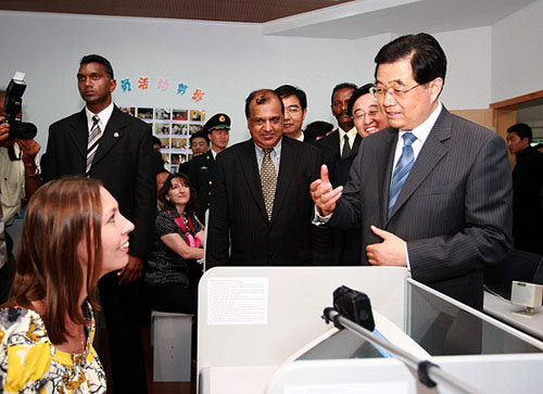 2月17日,正在毛里求斯访问的国家主席胡锦涛参观中国文化中心。这是胡锦涛主席同正在这里学习汉语的学员亲切交谈。新华社记者 鞠鹏摄