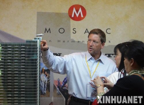 4月12日,来自美国马赛克公司的经销总经理托马斯(左)在向中国消费者介绍他们的房子。 4月10日至12日,美中房地产展示交易会在北京召开,该交易会由美中贸易发展协会等单位组织,70多家美国开发商和中介机构参加交易会。据主办方预计在3天时间内,会有500多套住宅意向成交。新华社记者 邢广利 摄
