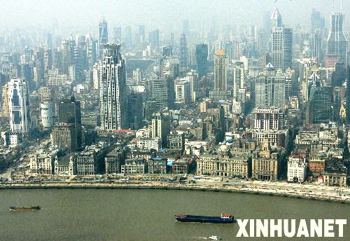 上海黄浦江边的外滩金融街鸟瞰(3月25日摄)。上海市商务委员会4月11日发布的信息显示,虽然遭遇金融危机,但2009年一季度上海外向型经济发展好于预期,实到外资23.2亿美元,比2008年同期增长2.3%,总体情况略好于周边地区及全国平均水平。其中,实到外资的74.4%投向第三产业,主要为增资,外商在上海还新设立了15家总部经济机构。新华社记者陈飞摄