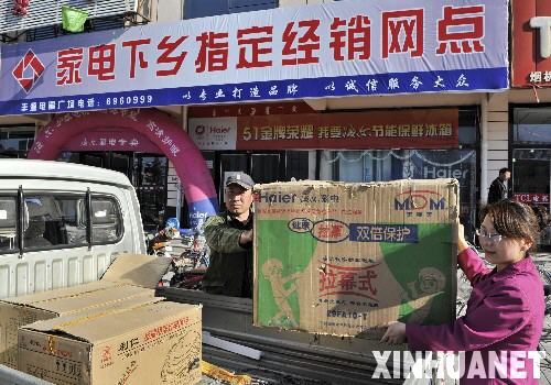 4月8日,锡林郭勒一家商场的售货员帮助顾客搬运购买的家电下乡产品。内蒙古农牧区自2008年12月1日开展家电下乡活动以来,家电下乡销售网点已达到1126家,销售家电下乡产品超过2万件。新华社记者李欣摄