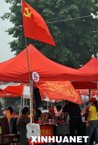 在彭州市一共产党员先锋队报名处,党旗在上空飘扬(5月23日摄)。四川大地震发生后,鲜艳的红旗飘扬在灾区各处。各级党团组织活跃在救灾一线。新华社记者 郝同前 摄(资料图片)