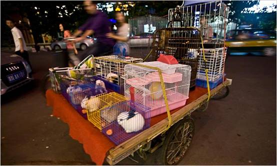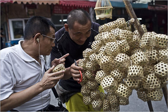 李海仑(音)属于不需要吆喝的小贩,他卖的是数百只放在竹篾笼子里的蛐蛐儿,随处都会发出震耳欲聋的尖锐响声。从七月到十月,李骑着车带着他的蛐蛐儿在城里穿梭,根据蛐蛐叫声的质量和买家的眼光,每只蛐蛐可卖得五角到一元。