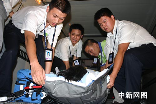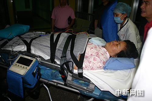 医护人员将林丽英抬上担架准备送往成都双流国际机场。