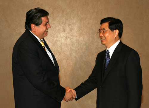 加西亚赞同胡锦涛对发展两国关系的建议,他表示,秘鲁以长远眼光看待和发展同中国的关系。秘鲁祝贺中国在经济社会发展过程中所取得的巨大成就,中国发展对秘鲁具有重要意义,秘鲁希望同中国发展密切、稳固的友好关系,在港口、电力、矿产、旅游等领域加强和扩大合作。