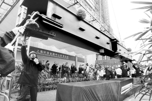 14日上午10时30分,上海环球金融中心最后一根钢梁起吊(记者周铭鲁 摄)