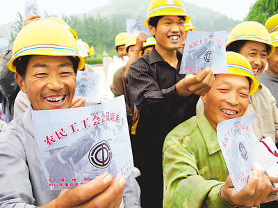 在济南务工的5000名外地农民加入当地工会组织,兴奋不已。江 浩摄