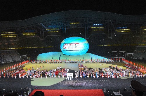 美丽的珠江岸边,圣火再度点燃,56个民族欢聚一堂,奏响了一曲和谐盛世的欢歌。在国旗、会旗等方队的引导下,广西、内蒙古、宁夏、西藏、新疆等自治区的代表队依次出场,包括台湾少数民族代表团在内的34个代表团的各民族运动员,身着五彩纷呈、绚丽夺目的民族服装,亦行亦舞,令人目不暇接。