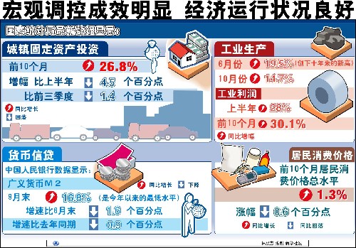 一是国民经济继续保持平稳快速增长。今年前三季度,国内生产总值166043亿元,同比增长11.5%,比去年同期加快0.7个百分点。但是比二季度回落了2.4个百分点,经济增长由偏快转为过热有所缓解。