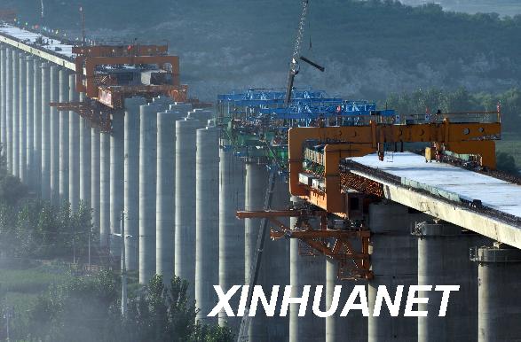 石太铁路冶河特大桥建设者在为空中现场浇筑桥梁做准备(摄于9月6日)。全长1688.8米的冶河特大桥是正在建设中的石太铁路(石家庄至太原)客运专线全线控制工期的重点工程。担负建桥施工的中铁二十二局集团四公司的建设者采用国际先进的空中现浇技术,首次在40米高空采用移动模架现浇每孔900吨重的大型箱梁,解决了地面浇筑桥梁大面积占用耕地、大型桥梁难以输送等问题,开创了我国空中现浇技术建设桥梁的先例。
