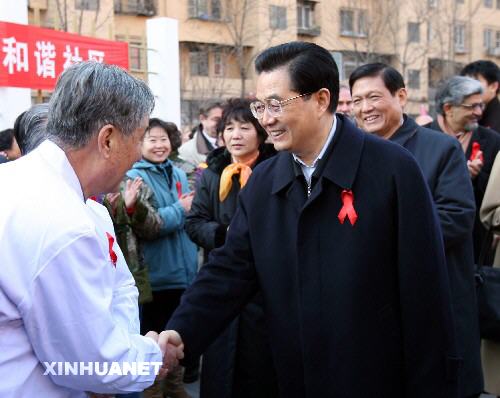 11月30日,在第20个世界艾滋病日到来之际,中共中央总书记、国家主席、中央军委主席胡锦涛来到北京市朝阳区考察艾滋病防治工作。这是胡锦涛在朝阳区秀水园社区同参加宣传咨询活动的防治艾滋病专家亲切交谈。新华社记者马占成摄