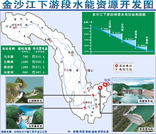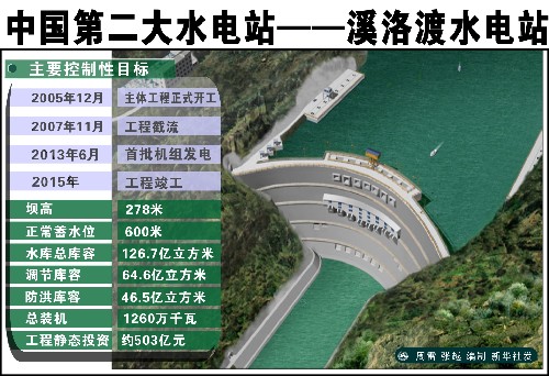已于上月7日成功截流的中国第二大水电站溪洛渡电站,就位于四川雷波县和云南永善县境内金沙江干流上,电站总装机容量为1260万千瓦,坝高278米,防洪库容46.5亿立方米。金沙江下游水电梯级开发最下游的向家坝水电站设计装机容量600万千瓦,计划2012年首批机组发电、2015年工程竣工,工程动态投资估算约180亿元。