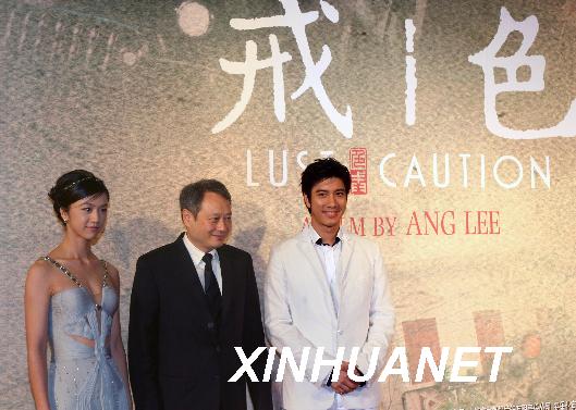 2007年10月31日晚,导演李安(中)和演员汤唯(左)、王力宏在首映礼上。当晚,电影《色·戒》在上海影城举行内地首映礼。新华社记者刘颖摄