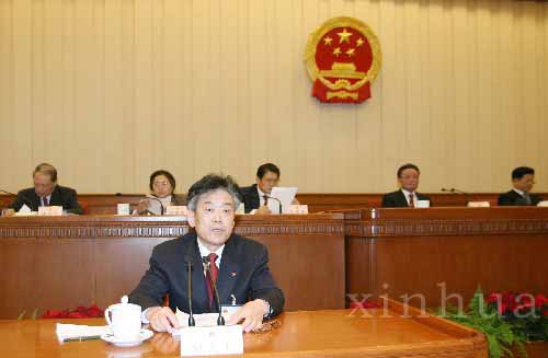 12月26日,十届全国人大常委会第三十一次会议在北京人民大会堂举行第二次全体会议。这是劳动和社会保障部副部长孙宝树报告有关部门维护职工合法权益工作情况。新华社记者黄敬文摄