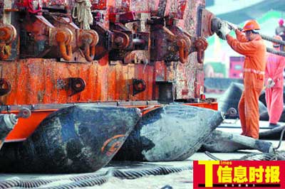 工作人员在暮色中加紧移动沉箱,每前进一点就停下,将后面露出来的气囊放气,吊到沉箱前方再次充气,卷扬机再次发动拖沉箱。共16个气囊,每个受力350吨。本版摄影 时报特派记者 何 建