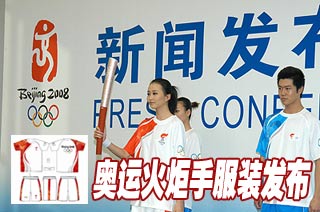 北京奥运新闻中心1月16日在北京奥运新闻中心新闻发布厅举行奥运火炬接力形象景观新闻发布会,图为新闻发布会现场北京奥运会火炬手服装和护跑手服装展示。新华网 张泳摄