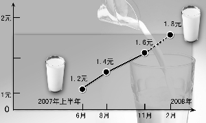 刘先生告诉记者,他家一直订的卫岗天元奶,2007年上半年的时候还是1.2元一瓶,2007年8月份涨到了1.4元,11月又涨了2毛到1.6元,时隔2个月,又要从1.6元涨到1.8元,算起来,这半年里,连涨两次,每次都涨2毛钱,涨幅已经远远超过10%!面对如此不断的涨价,刘先生说自己得考虑是不是该少订点了!