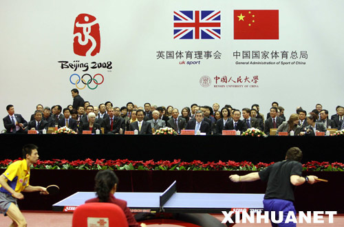 1月18日,中国国务院总理温家宝和来访的英国首相布朗来到北京中国人民大学,观看中英两国运动员乒乓球比赛。新华社记者 刘卫兵摄