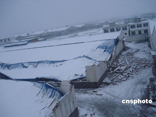 1月19日,由于连降暴雪,安徽合肥瑶海区工业园5000多平方米仓库厂房被积雪压塌,所幸没有造成人员伤亡。据悉,该工业园已免费提供2万平方米标准仓库,在确保安全的情况下,预计1月20日组织拆迁队伍扒开屋顶,推倒墙壁,把被埋物资全部转移。 中新社发 何保丰 摄