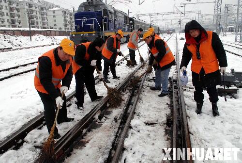1月20日,合肥火车站工作人员在清除铁道上的积雪,确保铁路列车安全。 当日9时20分,合肥市气象台继续发布暴雪黄色预警信号。连日来,合肥地区普降大雪,气象部门连续发布暴雪警报。目前降雪仍在持续,给市民出行带来不便。 新华社发