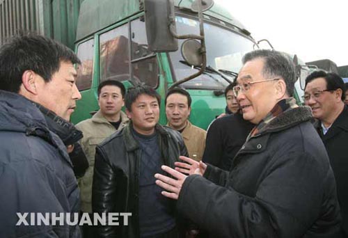 1月25日下午,中共中央政治局常委、国务院总理温家宝来到京石高速公路河北涿州服务区和北京西站实地考察,并就做好春运工作,保障安全畅通作出部署。这是温家宝总理在京石高速公路河北涿州服务区与货车司机交谈。 新华社记者姚大伟摄