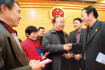 图为山东省济南市长清区法院法官日前给农民工发放拖欠工资及工程款。袁鹏 摄