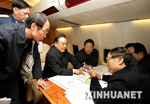 1月28日20时30分,中共中央政治局常委、国务院总理温家宝从北京赶赴湖南,考察抗冰救灾工作。这是温家宝总理1月28日夜在专机上与国务院有关部门负责人研究抗冰救灾工作。 新华社记者姚大伟摄