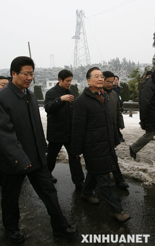 1月29日,中共中央政治局常委、国务院总理温家宝在湖南湘潭市郊外查看电力设施受损情况。 新华社记者姚大伟摄