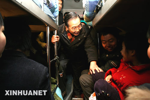 1月29日,中共中央政治局常委、国务院总理温家宝在京珠高速察看高速公路堵车情况。在京珠高速湘潭段,南下广东的车辆排着几十公里的长龙。温家宝总理亲自登上一辆客车慰问被困乘客。 新华社记者姚大伟摄