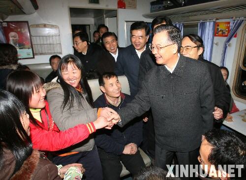 1月30日,中共中央政治局常委、国务院总理温家宝在广州火车站看望旅客。这是温家宝总理登上一列即将开往武昌的列车与旅客交谈。这列火车是从南昌紧急调来支援广州车站的。 新华社记者姚大伟摄