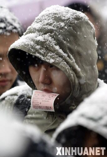 1月27日,一名旅客顶着大雪在合肥火车站进站候车。 当日,合肥再次降大到暴雪,致使公路、民航停运。许多准备回家过年的人顾不得人多拥挤、旅途劳累,冒着大雪涌入火车站,以求早日与家人团聚。 新华社记者 李健 摄