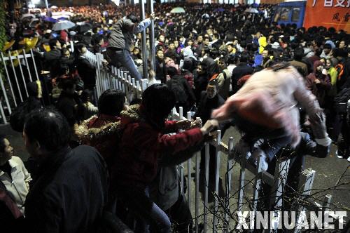 1月30日,广州火车站附近的一些滞留旅客在翻越栏杆。当日晚8时左右,约2万名滞留旅客在广交会流花展馆安置点七号门不足1000平方米的小广场发生拥挤现象。广州警方采取紧急措施,把离七号门最近的一个展馆内的旅客转移至别处,将拥挤在小广场上的旅客分批安置进室内避雨。据了解,虽然广州市政府设立了13个滞留旅客安置点,但是很多旅客纷纷涌向离广州火车站仅百米之遥的广交会流花展馆,而该展馆安置了6万余名旅客,已经爆满。 新华社记者 刘大伟 摄