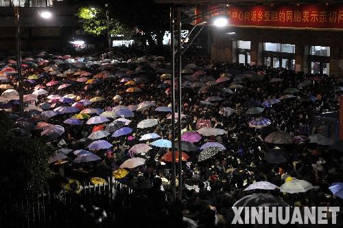 1月30日晚8时左右,约2万名滞留旅客在广交会流花展馆安置点七号门不足1000平方米的小广场发生拥挤现象。广州警方采取紧急措施,把离七号门最近的一个展馆内的旅客转移至别处,将拥挤在小广场上的旅客分批安置进室内避雨。