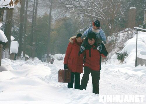 1月30日,一家三口在105国道岳西石关段涉雪前行。 近日,地处大别山区的安徽岳西县遭持续暴雪袭击,该县通往外界的唯一通道――105国道姚河段至温泉段因结冰积雪严重而中断。一些农民工归家心切,不顾雪厚山高,徒步返乡。 新华社发(储永志 摄)