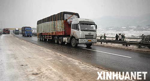1月31日,京珠高速公路湖南段和107国道湖南段已全线贯通。但目前冰雪天气仍然恶劣,路面通行能力低,车辆行驶缓慢。这是在京珠高速公路长沙至湘潭段缓慢行驶的长途货车(1月30日摄)。 新华社记者 龙弘涛 摄