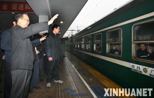 1月30日,中共中央政治局常委、国务院总理温家宝在广州火车站看望旅客。这是温家宝总理在站台上为一列发往武昌的旅客列车送行。这列火车是从南昌紧急调来支援广州车站的。 新华社记者姚大伟摄