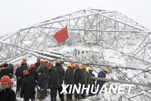 资料图片:湖北省电力公司专家组部分成员在湖北省通山县输电线路毁坏现场研究抢修方案(2月2日摄)。新华社发