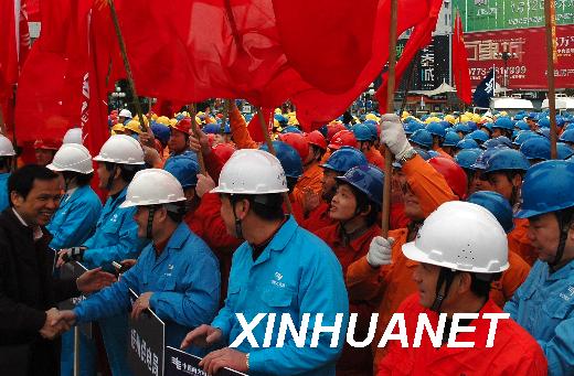 资料图片:2008年2月10日,誓师大会现场,一名市民自发走上前来与电力职工握手。当日,广西南方电网公司在桂林举行誓师大会,电网抢修单位层层签订了责任状,保证在2月底完成电网修复工作。从2月7日起,桂林电网抢修工作进入全面恢复性修复阶段,15000多名电力职工将全力完成修复任务。新华社发(杨绍功摄)