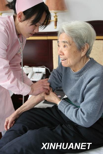 图片说明:1月25日,在养老基地颐年山庄内,一名护理员在为一位退休老人测量血压。近日,中国资产经营管理公司利用央企闲置资产改造建立的首家养老基地――城通颐年山庄在北京落成,并迎来了首批来此居住养老的退休老人。2007年6月,在军工企业改制和社会老龄化的大背景下,中资公司投资3000万元,将闲置多年的北京燕京汽车厂一分厂旧厂房加以改造,发展养老产业,并积极探索多种养老模式。此举既盘活了企业资产,又为社会养老开辟了新路子。(新华社记者 李明放 摄)