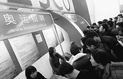 2月17日开幕的2008年北京春季招聘会首次设立了奥运专场,部分奥运供应商、服务商现场揽才。其中,一家中介机构为外资企业在奥运期间招聘400名司机,打出了最高8000元的月薪。吴长青摄