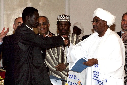 这张法新社发布的照片显示的是2006年5月5日,苏丹达尔富尔反政府武装“苏丹解放运动”的领导人明尼·明纳韦(左)与苏丹政府代表马杰祖卜·哈利法在尼日利亚首都阿布贾签署和平协议后握手。新华社发