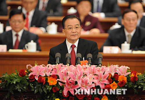 3月5日,第十一届全国人民代表大会第一次会议在北京人民大会堂开幕。国务院总理温家宝代表国务院向大会作政府工作报告。 新华社记者李学仁摄