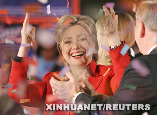 3月4日,在美国俄亥俄州首府哥伦布,来自纽约州的美国国会参议员希拉里与支持者庆祝预选胜利。 新华社/路透