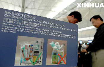 (资料图)2007年3月21日, 香港机场管理局在客运大楼贴出新保安措施的告示。当日,香港国际机场实施新保安措施,所有离港及转机旅客只能随身携带容量不超过100毫升的液体、凝胶及喷雾物品,并须放在一个密封的透明胶袋内。 新华社记者吕小炜摄