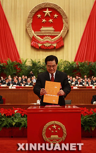 人大一次会选出新一届国家领导人 胡锦涛当选主席