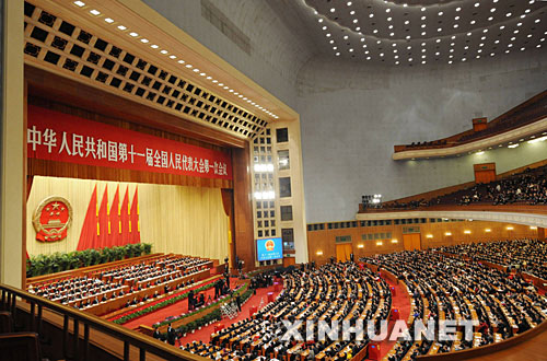 3月15日,十一届全国人大一次会议在北京人民大会堂举行第五次全体会议,这是大会会场。 新华社记者 杨宗友 摄